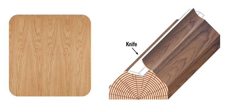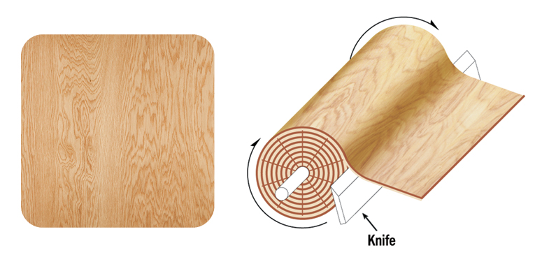 The log is centered in the lathe and turned against a knife blade at a slight angle following the log’s annular growth rings, producing a multi-patterned grain veneer.