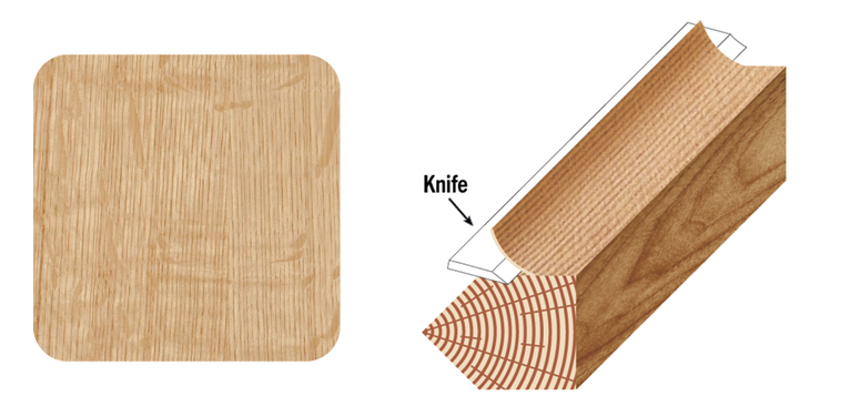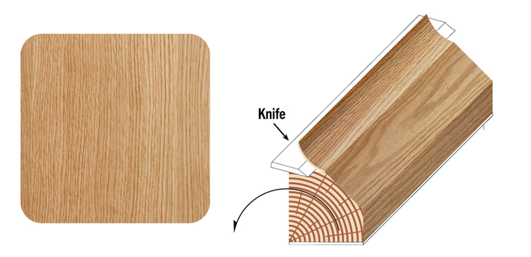 Produces a narrow, striped grain veneer where the growth rings of the log strike the blade at approximately right angles.